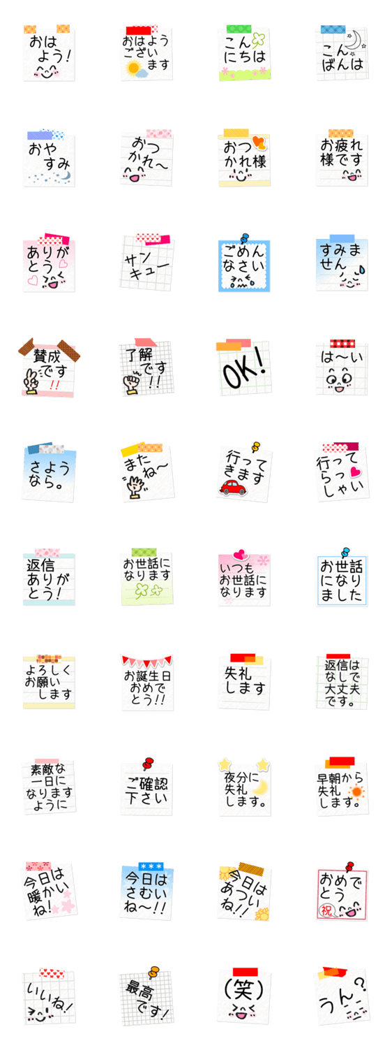 大きな文字で読みやすい、かわいい挨拶のメモです。毎日使う普段使いの言葉から敬語まで、仕事でもプライベートでも使えます。