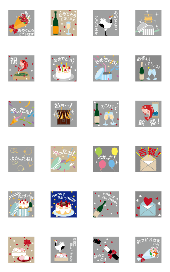 箱から中身が出てお祝いや喜びを伝えます。乾杯したくなるお祝い事から日常の喜び表現にも。誕生日、ケーキ、シャンパン、花束、卒業、和風物あり。キャラ無しで大人にも。