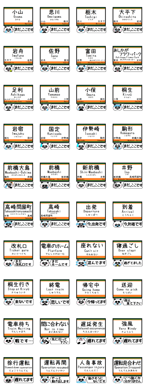 かわいいパンダ 両毛線(小山,思川,栃木,大平下,岩舟,佐野,富田,足利,山前,小俣,桐生,岩宿,国定,伊勢崎,駒形,前橋大島,前橋,新前橋)上越線(井野,高崎問屋町,高崎)駅名を連絡