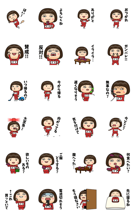 ママ(まま)が使う芋ジャージの名前スタンプ『家族連絡編』。一緒に暮らしている家族、同棲中のカップル、ルームシェアや同居中の友達との連絡に使えます!