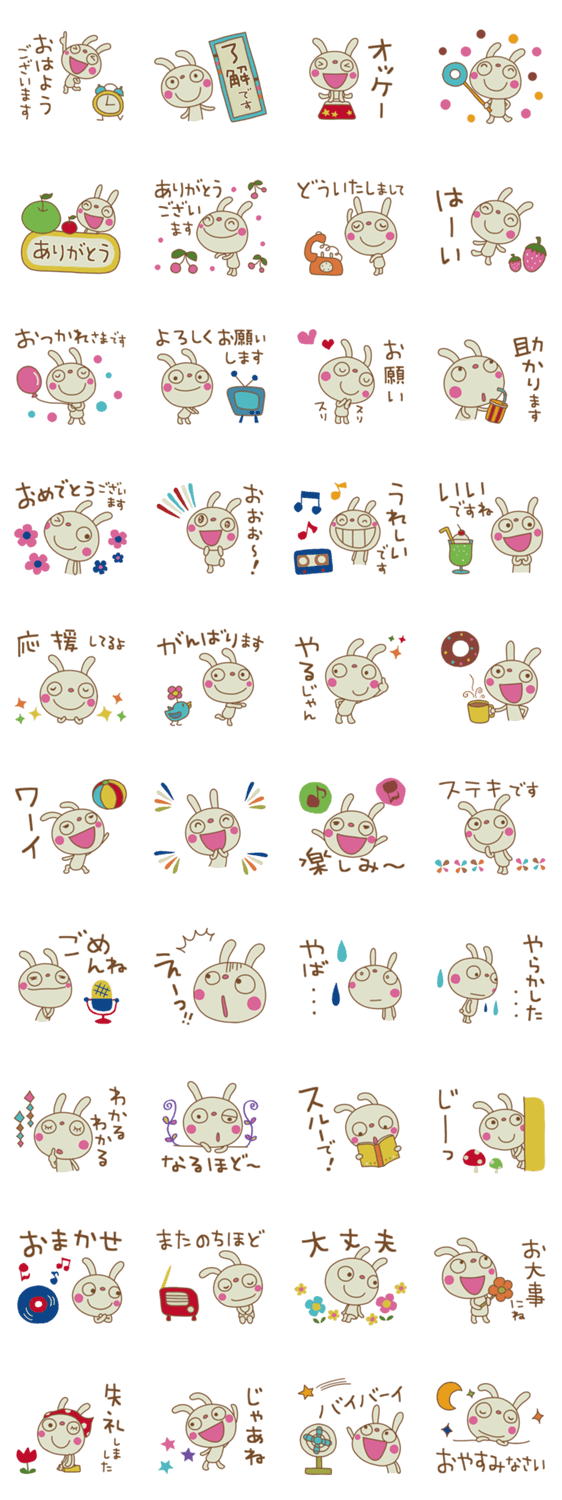 | スタンプ説明 | 懐かしいレトロ風の、ふんわかウサギ。「おはようございます」から「了解です」まで。使いやすい日常言葉集。いつもとちょっと違う色彩の、ふんわかウサギを届けよう。 |
