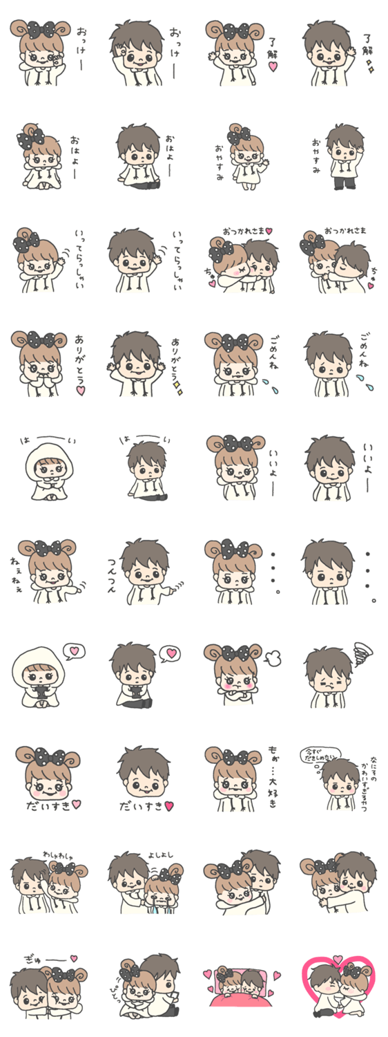 パールリボンちゃんのカップルスタンプです。彼氏彼女、夫婦はもちろん、友達など大好きな人と一緒に使ってね。