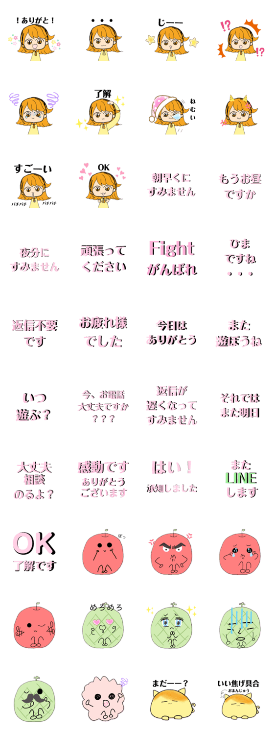 ネコ毛の女の子と立体文字とりんごとメロン、おまんじゅうの詰め合わせスタンプです。