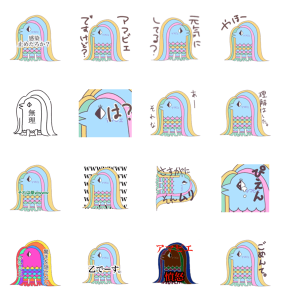 LINE Creators Studioでつくったスタンプです。日本の妖怪アマビエをイメージしました!友達相手にも使いやすい可愛いスタンプです。