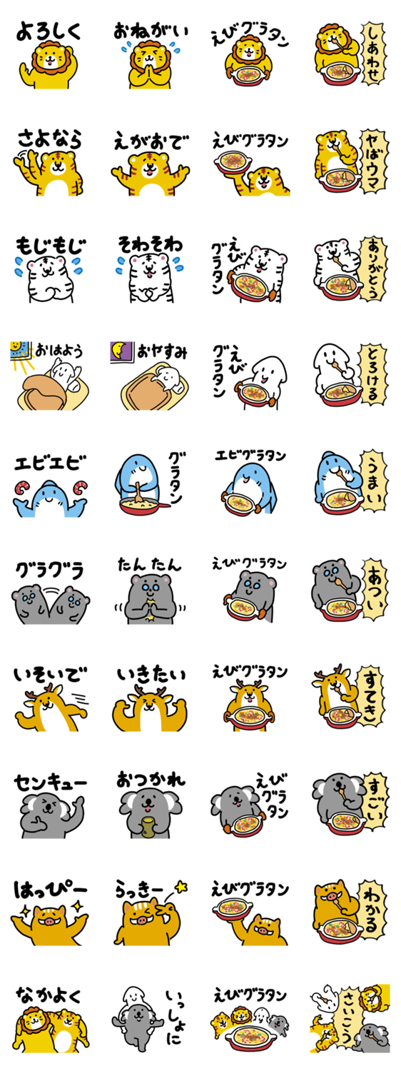 エビグラタンを食べればみんな幸せ!出演:ライオンさん、トラさん、ホワイトタイガーさん、イカさん、サメさん、ネズミさん、シカさん、コアラさん、イノシシさん