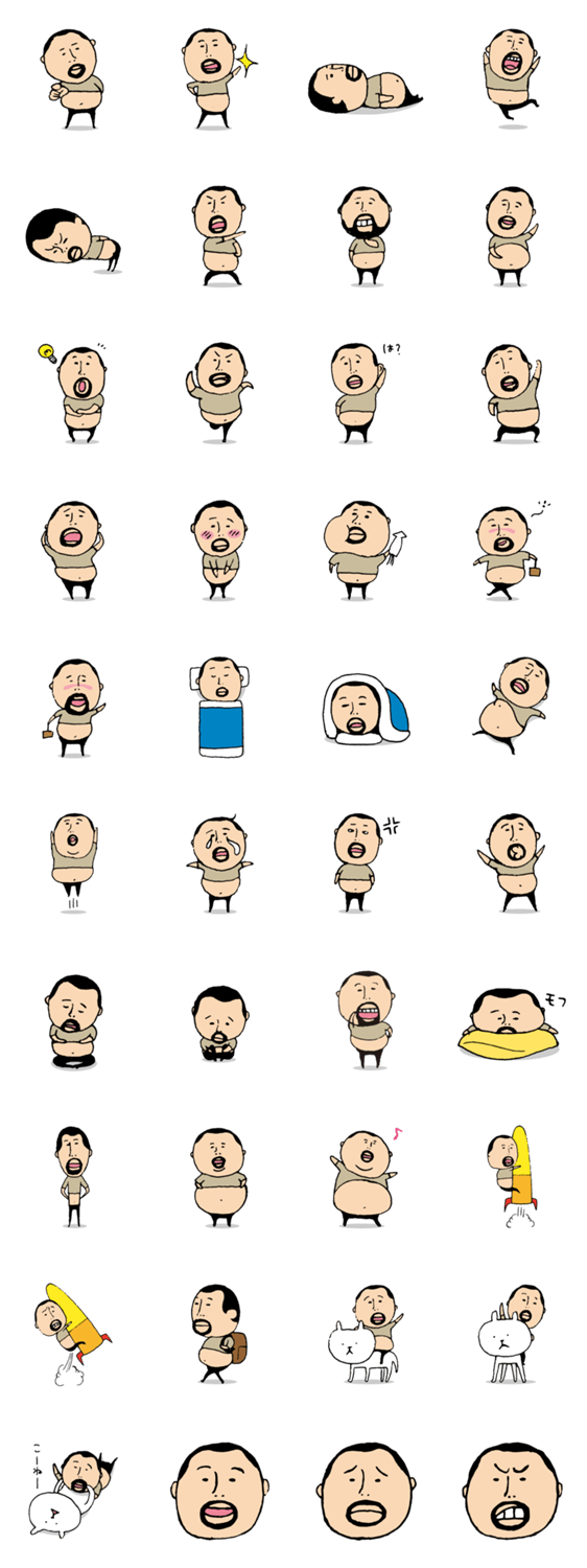 | スタンプ説明 | 丸いひげが特徴のどこにでもいそうな父さんPart2です。相変わらずのポッコリビールっ腹が可愛らしい。どこにでもいそうなひげぽちゃ父さんです。 |
