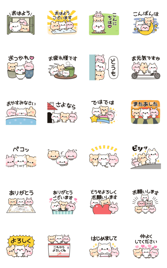 気づかいのできるネコとその友達のうさぎ・くまの便利な挨拶セット♪敬語・タメ語両方あるので誰にでも使える♪新生活・新学期・入学入社などに使える初めましての挨拶も!※あいさつスタンプキャンペーンの対象スタンプです。対象スタンプ受信者に、キャンペーン公式アカウントから自動メッセージが届きます(対象期間:2020/4/2〜4/8)