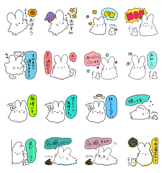 日常で使えるシュールでかわいいうさぎのスタンプです。 家族にも友人にも上司にも気軽に送ってください。