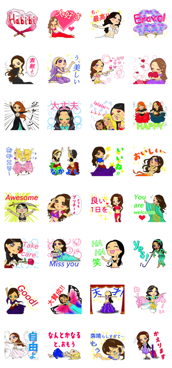 ベリーダンスのスタンプです。 前向きな表現を、多数集めました。 ダンス仲間や、素敵な人を褒めたい時にピッタリ。毎日をハッピーに!