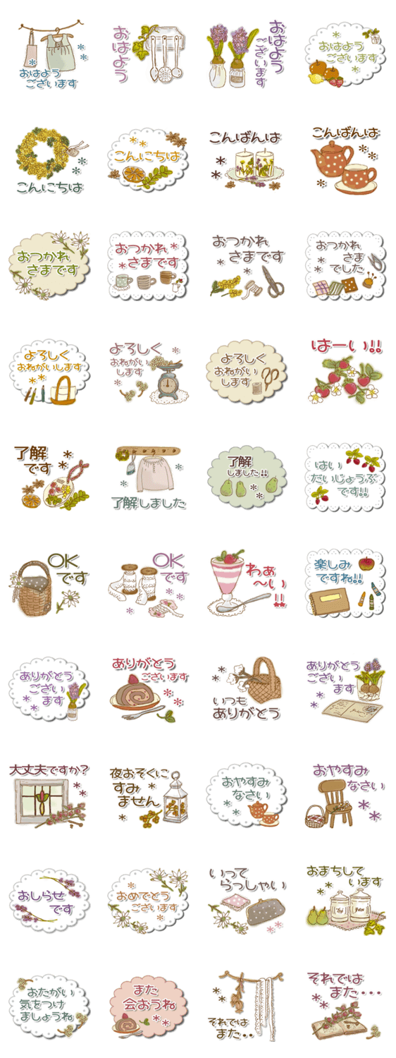 ナチュラルな雑貨が好きな人のためのスタンプです。ほんわか癒やしのイラストです。日常、よく使う挨拶や言葉を入れました。職場の方やPTAの連絡などにも使えます。※あいさつスタンプキャンペーンの対象スタンプです。対象スタンプ受信者に、キャンペーン公式アカウントから自動メッセージが届きます(対象期間:2020/4/2〜4/8)