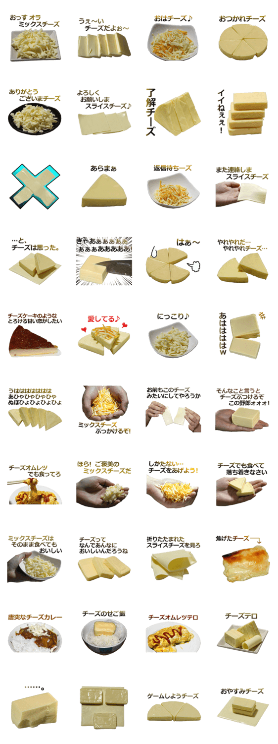 チーズの実写スタンプです!そのまま食べても、料理に入れてもおいしいチーズ!あなたのラインをチーズ一色に♪超高画質です。飯テロにも。写真食べ物スタンプシリーズ。
