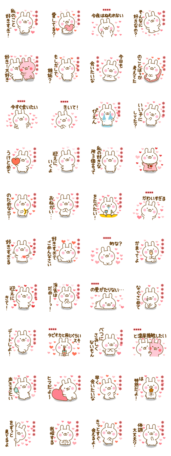 ゆる~く、可愛いうさぎ(うさひな)の好きすぎる愛する人に送るラブラブ名前カスタムスタンプ第3弾です♥6文字まで自由に名前をかえれるよ♪