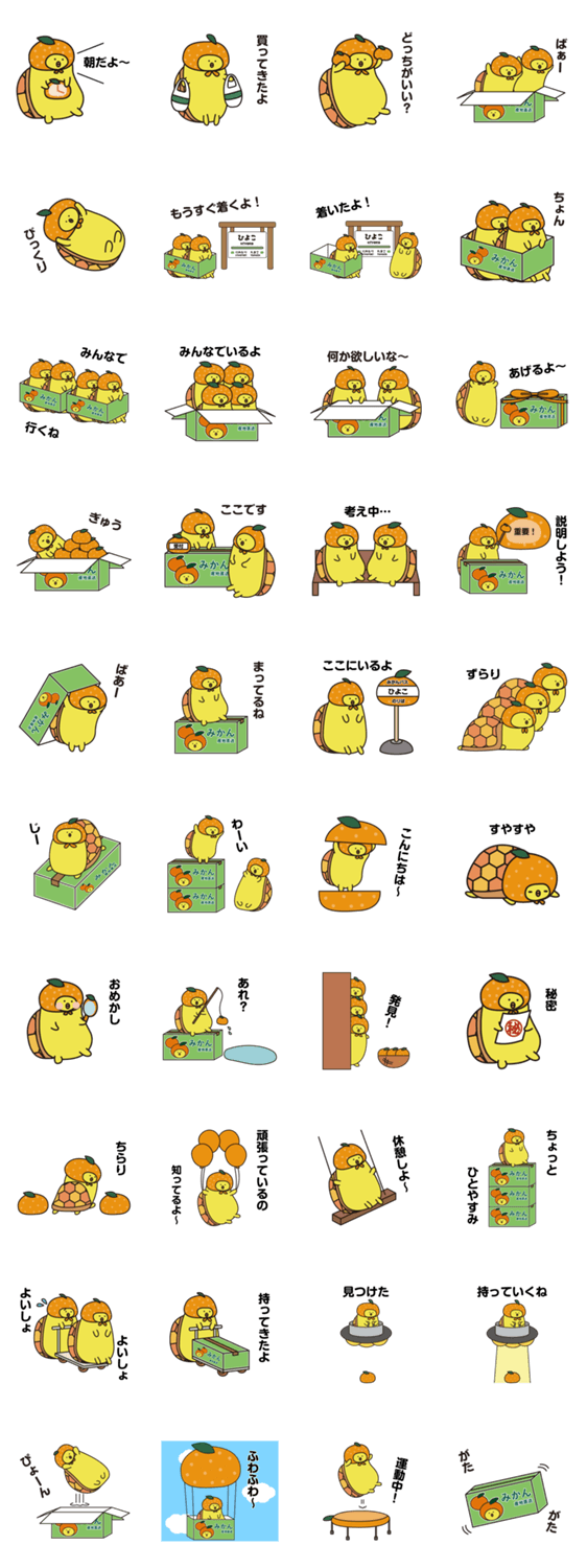 こうらアニマルズのひよこちゃんがみかんの被り物をつけたラインスタンプです。