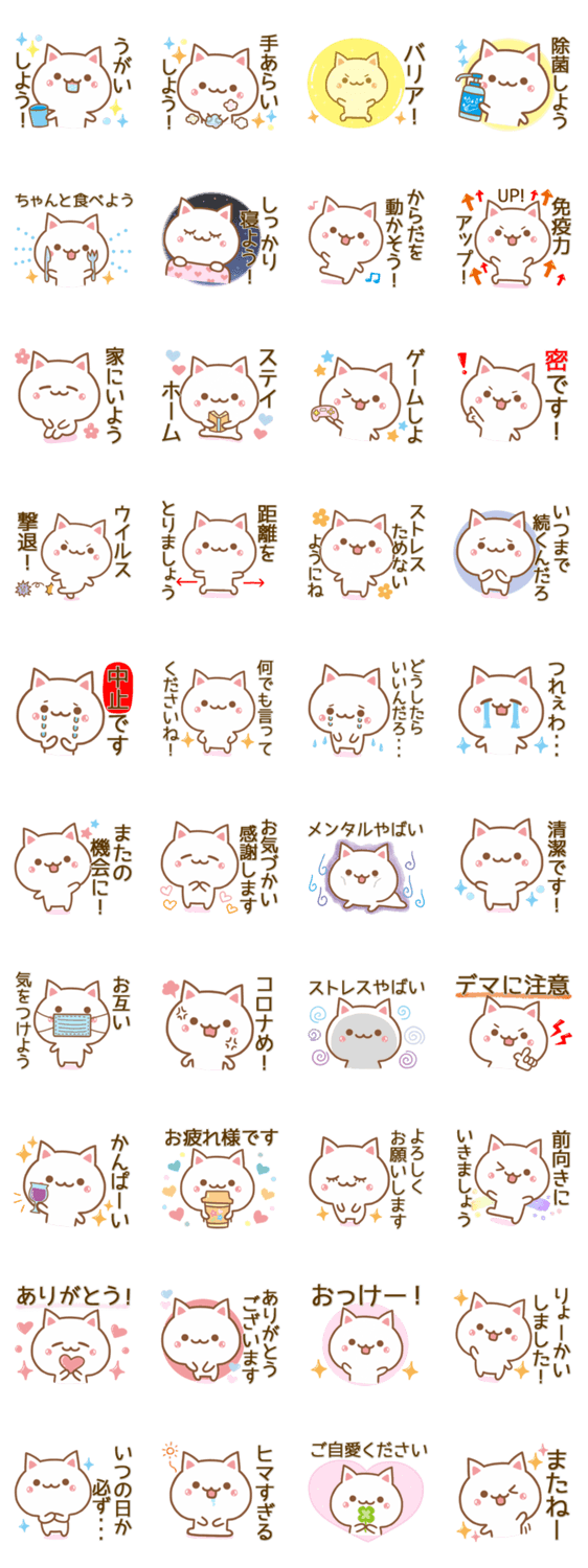 新型コロナウイルス・インフルエンザ・風邪などの感染予防や注意喚起をする、ねこのスタンプです。相手を気づかう言葉なども入っています。