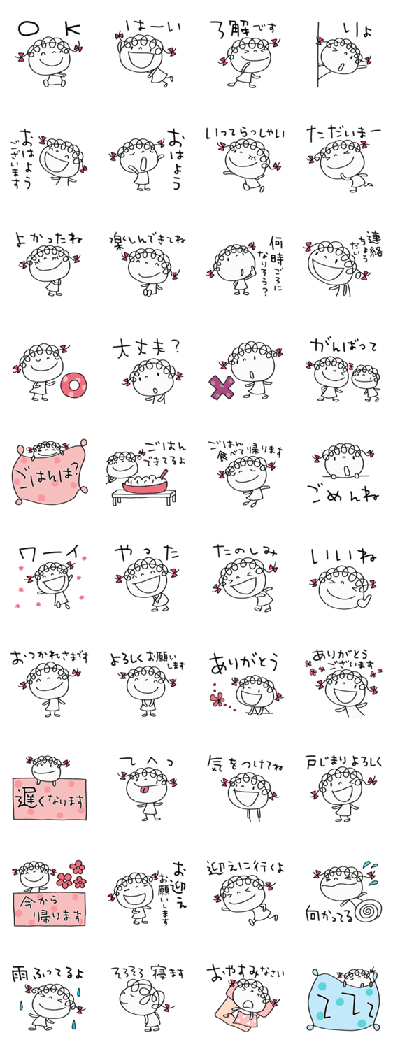 | スタンプ説明 | くるりんとした髪に赤いリボンの女の子。今回は家族連絡用。「はーい」「今から帰ります」から「遅くなります」まで。家族、友人、お仕事でも。 |