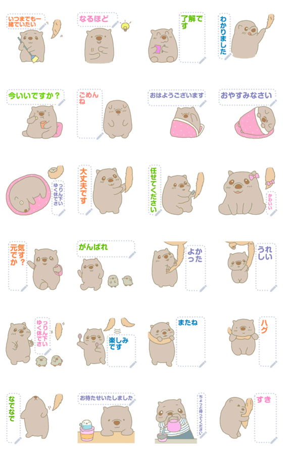 | スタンプ説明 | ウォンバットの毎日使える基本のスタンプです。文字は購入後何度でも変更できます。 |