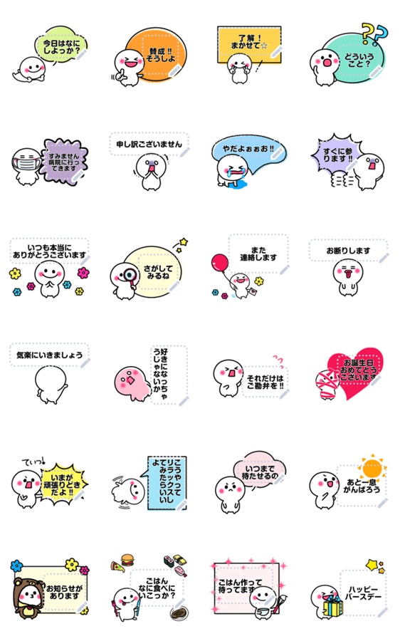 喜怒哀楽の表情があるメッセージスタンプ♡吹き出しは縦書き、横書き両方あり。目上の方、友達、恋人、毎日誰にでも使いやすい大人可愛いセット♡白縁でどんな背景にも♡