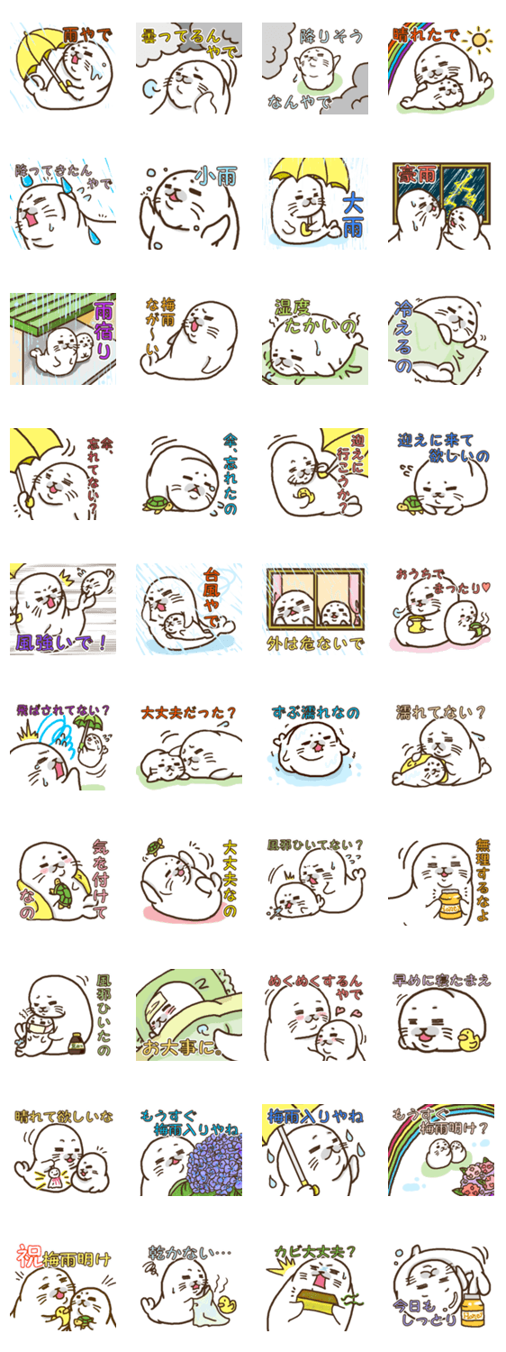 もっちりボディの白いアザラシ、どどちゃん(どど丸)と、弟でまろ眉のまろちゃん(どどまろ)の仲良しスタンプ、梅雨・雨用。まろちゃんの口ぐせは「~なの」、好物は黒蜜。