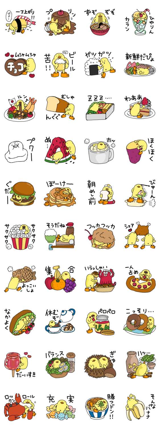 食べるの大好きなぴよと色んな食べ物とのスタンプです。 なんだかぴよが美味しそうなスタンプです。 LINEでの会話をしながらおなかが空いちゃうかもしれないスタンプです。