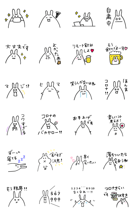 「日常で使いやすいウサギのスタンプ」のコロナバージョン!自粛の日々でも使えるスタンプ!こんな時こそ友達、家族、恋人とたくさんLINEして楽しもう♡