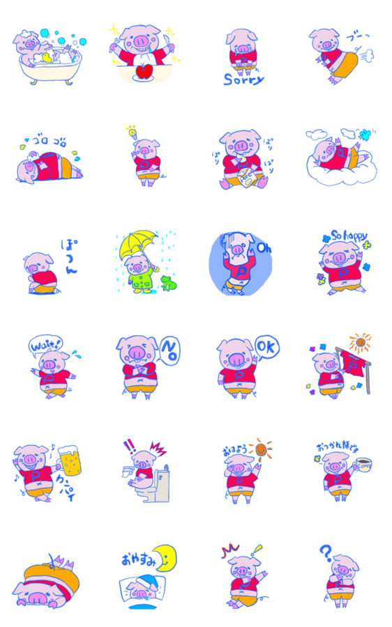 ぶたさんのPちゃんです。日常系の挨拶など使いやすそうなスタンプ作りました。