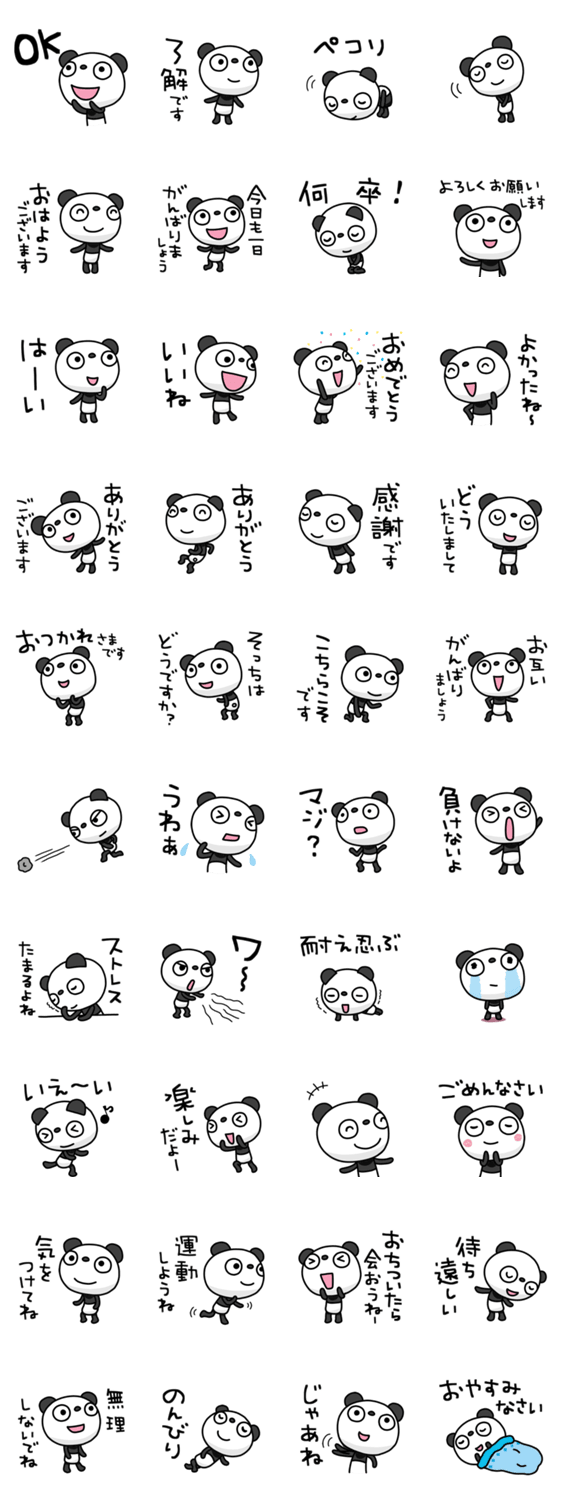 | スタンプ説明 | ふんわかパンダのポップタッチ風。第6弾。「はーい」「OK」から「じゃあね」まで。さらっと気持ちを伝えるスタンプがいっぱい。楽しい気分で、あなたの気持ちを届けよう。 |