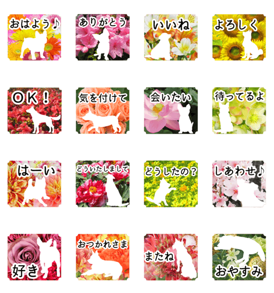 暮らしのメッセージに本物の花を添えるスタンプです。花と犬(Dog)。おはよう・好き・待ってるよ・おつかれさま etc. 写真 実写 リアル フラワー flower