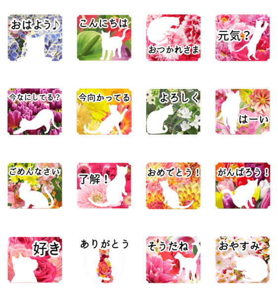 暮らしのメッセージに本物の花を添えるスタンプです。花と猫(Cat)。おつかれさま・よろしく・了解・ありがとう etc. 写真 実写 リアル フラワー flower