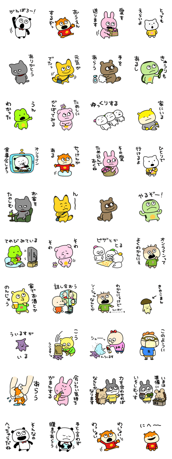 | スタンプ説明 | みんなを応援するためにスタジオUGオールスターズが大集合しました。※クリエイターへの配当金は、支援金として医療機関や新型コロナで困っている人の支援機関に届けます。 |