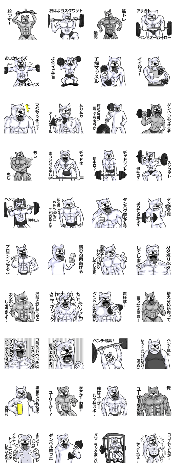 筋トレをしている人のためのスタンプです。トレーニー,筋肉,ウェイトトレーニング,ボディビルダー,フィジーク,カタボリック,マッチョ,プロテイン,ジムあるあるなど。