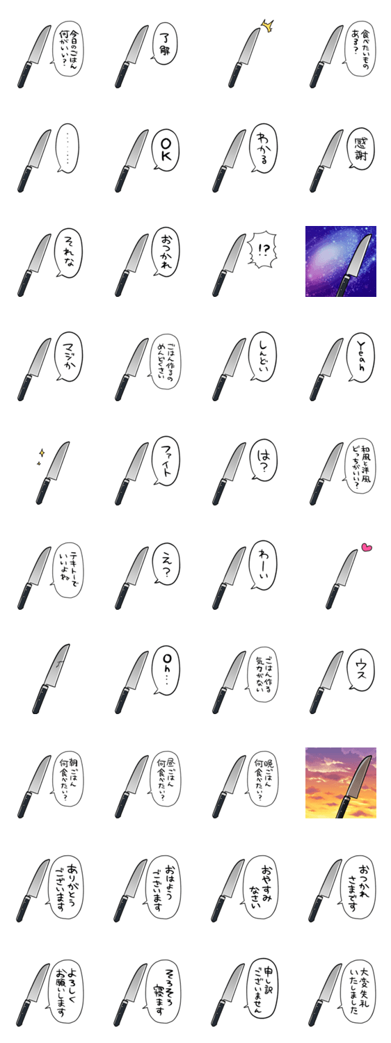 包丁のスタンプです。毎日の献立を考える手助けになれば幸いです。だいたい今日のごはんの事を考えてます。