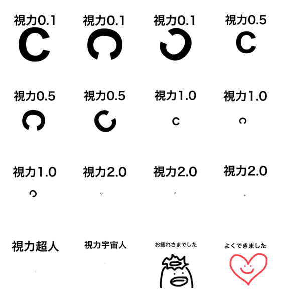 | スタンプ説明 | LINEスタンプで視力検査をしてみよう!1メートル離れて挑戦してね |