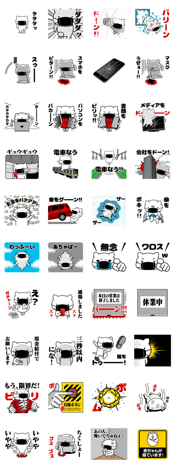 | スタンプ説明 | 緊急事態宣言/コロナウイルス/自宅待機/コロナストレス/黒マスク/自粛中/社会/発散/煽り/怒り/爆発/ウザい/恐怖/イライラ/叫び/破天荒/暴れる/家族/恋人/友人/解消 |
