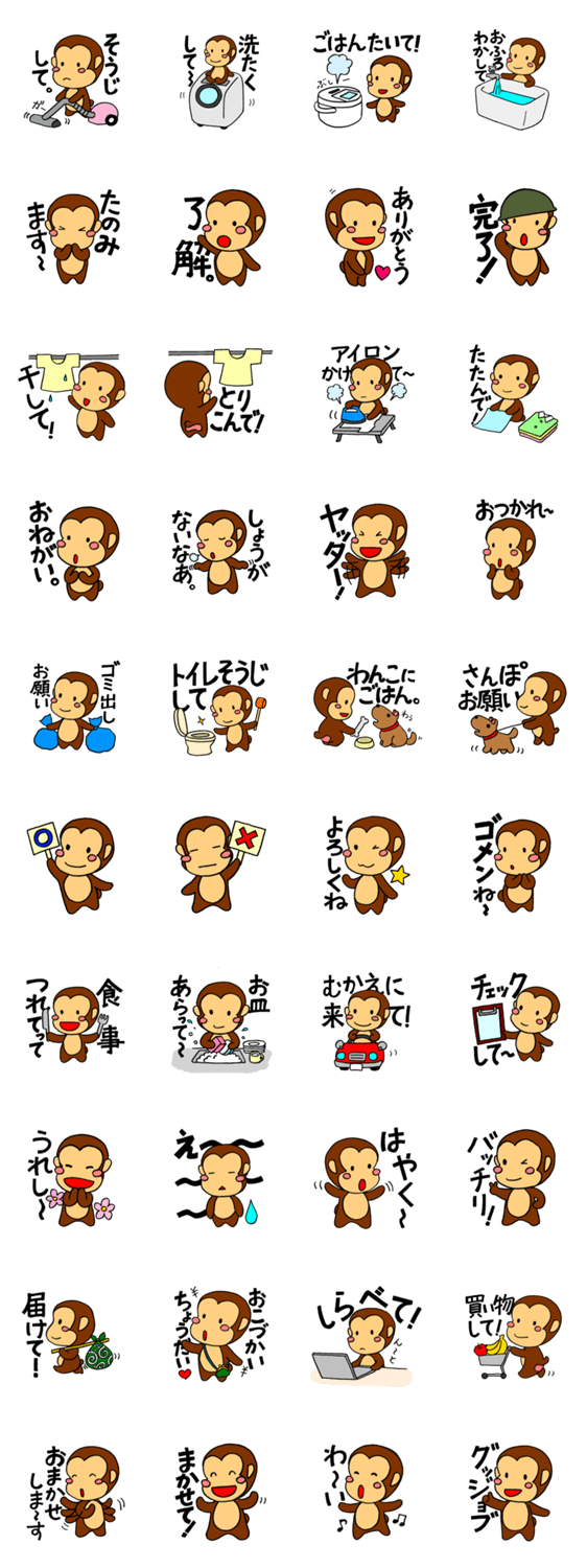 日常のちょっとした頼みごとをおさるが代わってお願いするよ! 頼む人も頼まれる人も楽しい気持ちにさせるスタンプです。