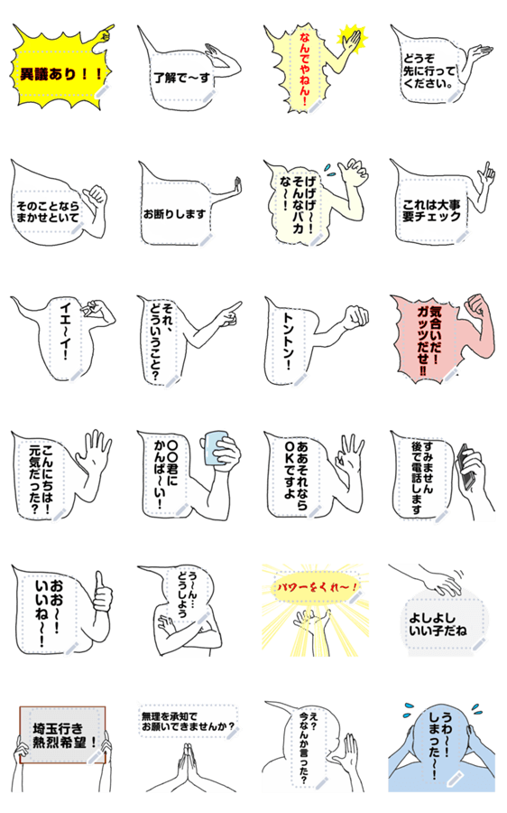 ふきだしに手が出ているメッセージスタンプです。手が出ていることによっていろんな感情や表現ができますので、ただの返信だけじゃ物足りない時などにお使いください。 現在この商品は一部のスマートフォン版LINE 10.3.0以上のトークルームでのみ使用できます。動作環境の最新情報はヘルプをご確認ください。