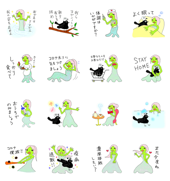 病魔調伏の力を持つとされる妖怪、アマビエとヨゲンノトリのスタンプです。コロナの流行が一日も早く終息しますように。