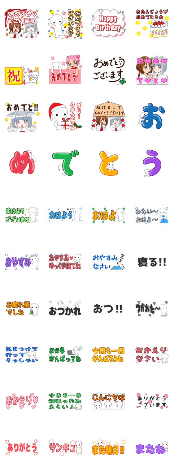 いろんな【おめでとう】を相手によって使い分けできます。お祝いと毎日の挨拶に使えるスタンプです。祝/誕生日/挨拶/毎日/日常/省スペース
