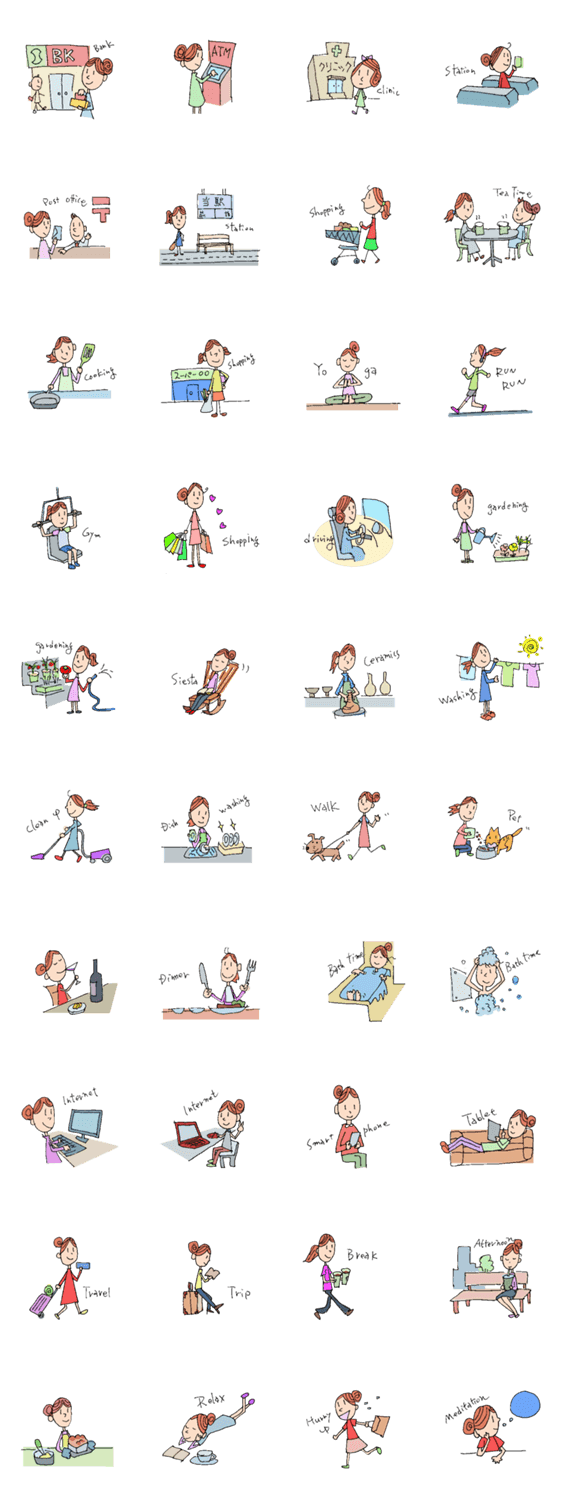 ライフシーンをイラスト化したシンプルスタンプ。日常の何気ないメッセージの最後にカットイラストを添える感じでご使用いただければと。