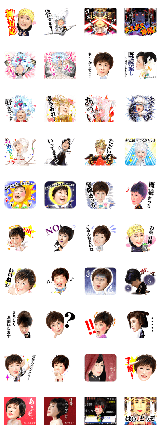 | スタンプ説明 | ついに「ラスボス」こと小林幸子がLINEスタンプに降臨!おなじみの豪華絢爛な衣装はもちろん、貴重なコスプレ、さらにはメガ幸子まで…いつもの会話が豪華になるかも!? |