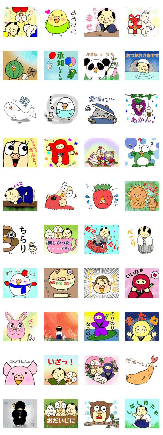 着替えの大好きなキグルミ鳥さんと仲良しの忍者侍さん、ペットのちぃたくんのほっこり笑えるスタンプです。