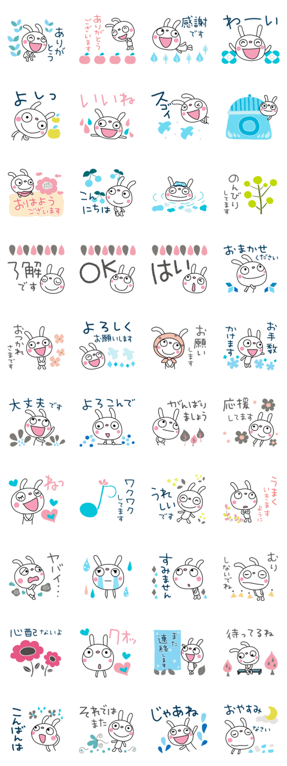 | スタンプ説明 | 涼しげな北欧風の、ふんわかウサギ。「感謝です」から「いいね」まで。爽やかなデザインのスタンプ集。心軽やかに、ふんわかメッセージを届けよう。 |