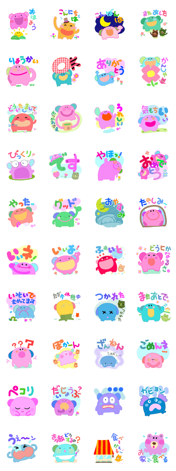 | スタンプ説明 | ほんわかコゾウのカラフルスタンプです。あったら会話も楽しくなるスタンプもあります。使ってみてね。 |