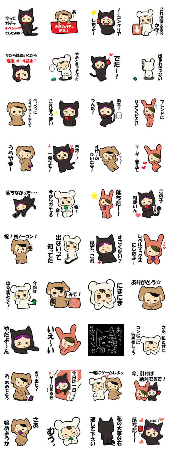 着ぐるみ4人がケータイで楽しくゲームしてるスタンプを作りました。スクショと組み合わせて使ってください。