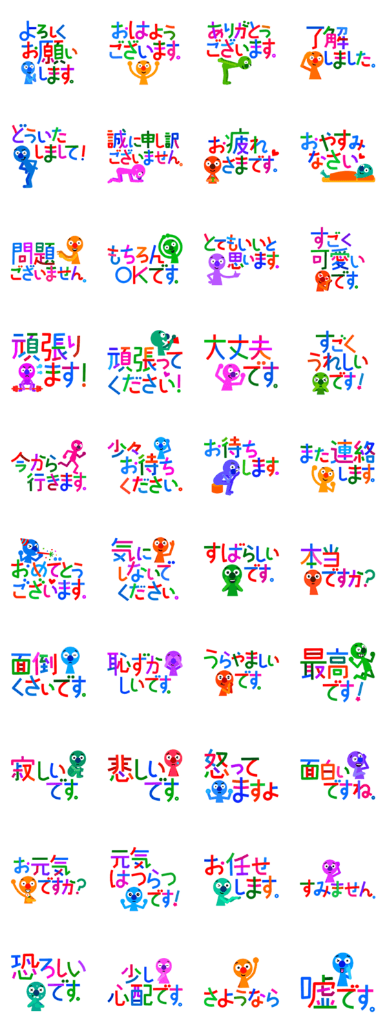 カラフルなデカ文字とカラフルなキャラクターの毎日使える敬語スタンプです。よろしくお願いします。