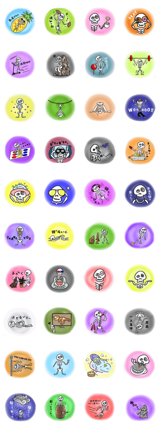 ガイコツさんの何気ない気ままな日常をカラフルに描いたスタンプです。会話にも僅かな彩りを与えてくれるかもしれません。