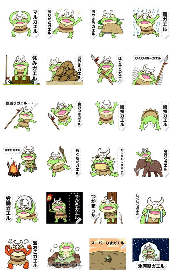 | スタンプ説明 | 世界最古の言語「カエル語」を使う原始ガエルのメッセージスタンプです。 現在この商品は一部のスマートフォン版LINE 10.3.0以上のトークルームでのみ使用できます。動作環境の最新情報はヘルプをご確認ください。 |