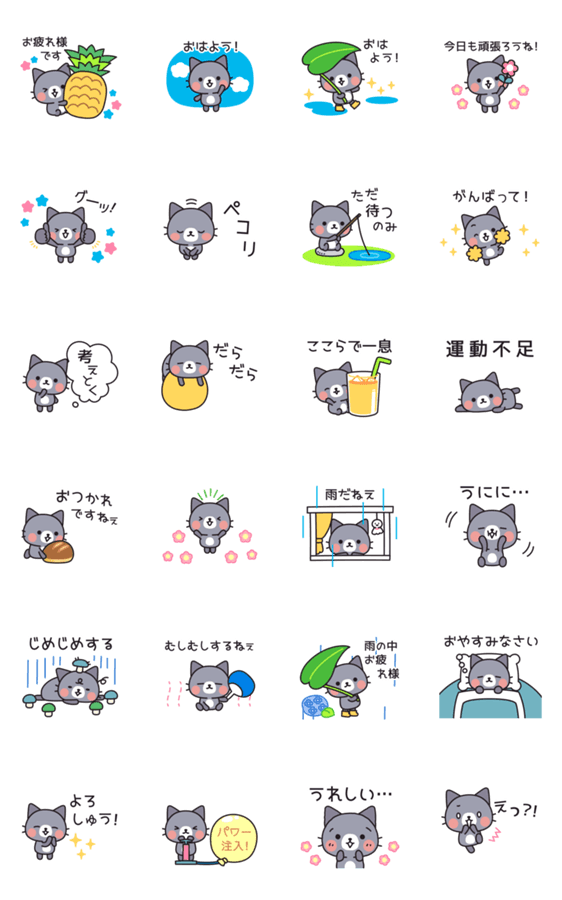 少しじめっとしてきた今の時期に使える灰色の猫の日常アニメーションスタンプです!