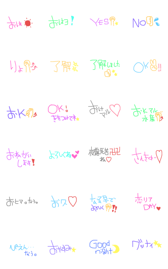 日常必須会話や挨拶なので購入して間違いなし!了解,okなどたくさん使うけどバリエーションがないという悩みを解決!!手書き文字で気軽に可愛く使えます。gal.jk.girl専用