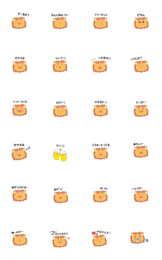 | スタンプ説明 | かわいいシーサーのうちなーぐちスタンプです。 日常で使いやすい挨拶や言葉を集めました! |