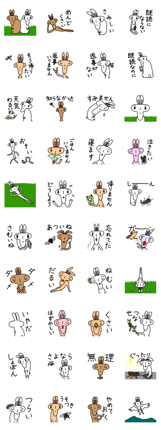貧相な顔立ちの陰気なうさぎが、ネガティブな気持ちを代弁する動物スタンプです。こっそりまぎれこんでいる昆虫たちの、マニアック過ぎて伝わらないふるまいにもご注目。